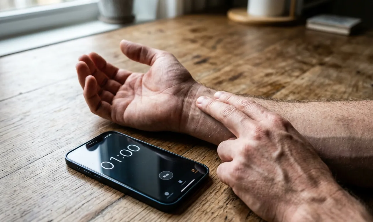 Nejprve byste se měli v klidu posadit a nahmatat pulzaci na zápěstí nebo na krku.
