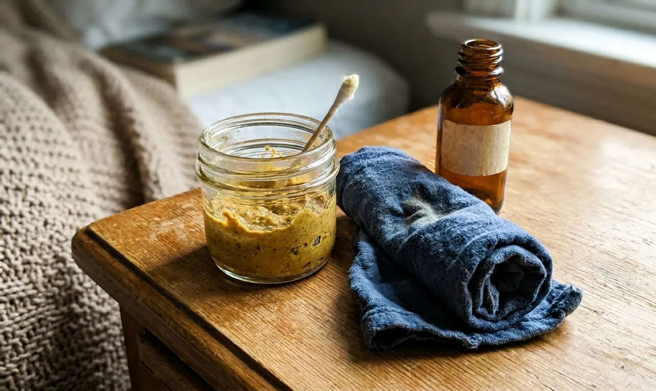 Aplikace domácích hřejivých mastí na bázi hořčice nebo přírodního kafru.
